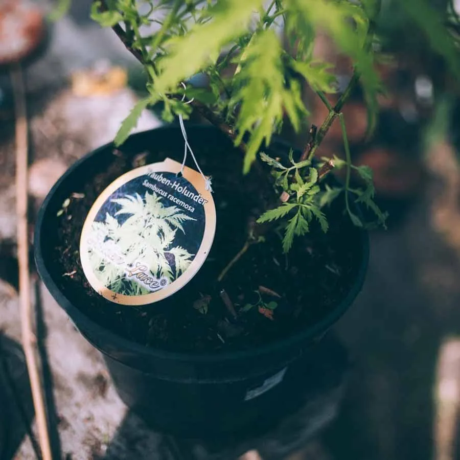 Druvfläder Golden Lace (Sambucus racemosa) är en prydnadsfläder med vackert flikade blad i lysande gul färg. Mycket effektfull tillsammans med andra mörkgröna eller röda växter, häckar eller mörka husfasader.