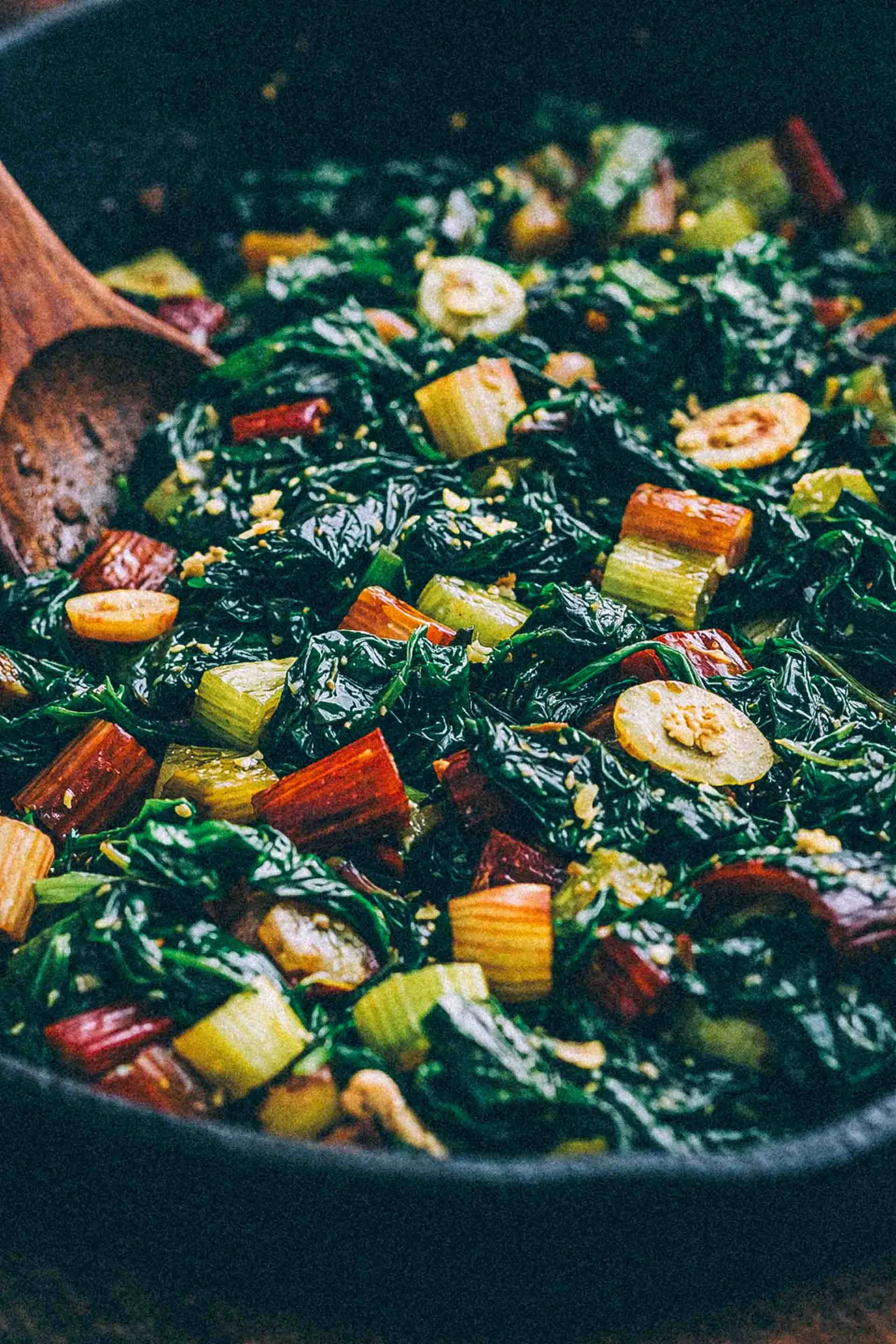 Lägg i stjälkarna och stek 2–3 minuter.